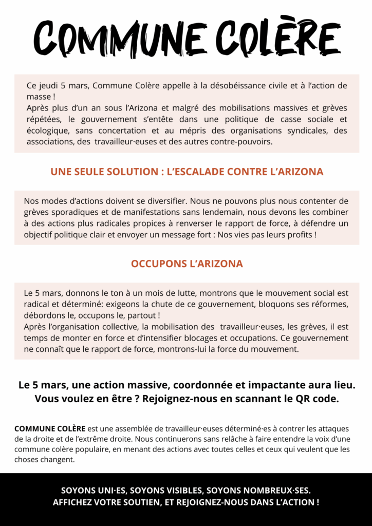 Nous avons besoin de VOUS pour faire grandir la résistance et amplifier notre voix collective ! Imprimez nos tracts, distribuez-les et placardez-les dans vos quartiers, vos lieux de travail, vos universités, partout où vous le pouvez. Chaque tract qui apparaît est un appel à l’action, un message de solidarité et un soutien visible à la lutte.